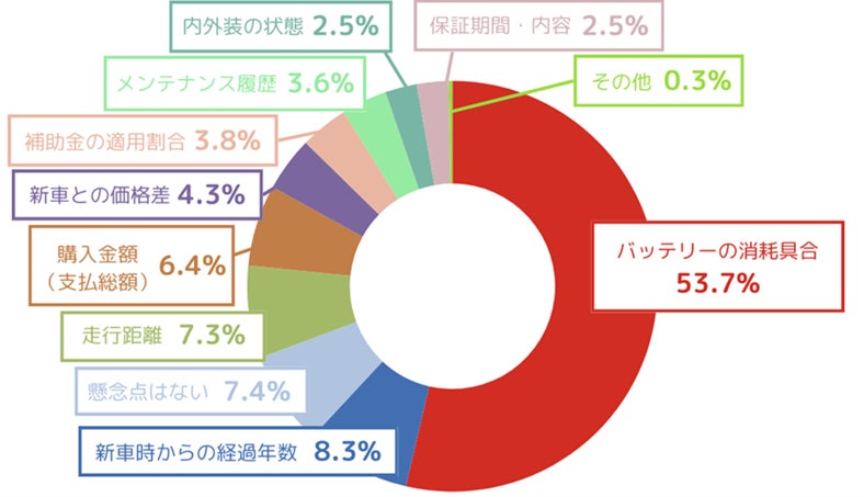 中古車での電気自動車(BEV車)購入を検討する場合、最も気になる点を聞いたところ、「バッテリーの消耗具合」と回答した人が約半数を占めました。一方で「懸念点はない」と回答した人も3番目に多い7.4%となり、中古車であることを気にしていない人も一定数見られることが分かりました。
