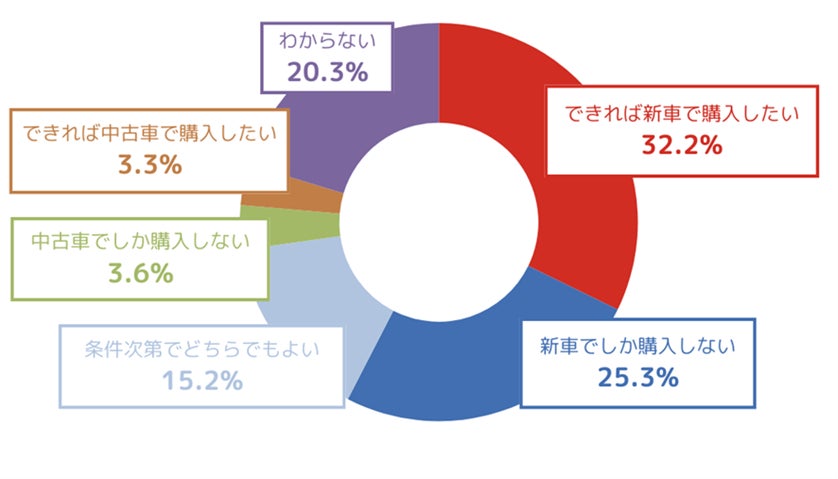 電気自動車(BEV車)を購入することになった場合、新車と中古車のどちらで購入するかを聞いたところ、「できれば新車で購入したい」が32.2%、「新車でしか購入しない」が25.3%と併せて57.5%が新車での購入を希望しました。一方で「できれば中古車購入したい」と「中古車でしか購入しない」を合わせても6.9%となり、BEV車を購入する際に中古車でも良いと考える人は少ない結果となりました。