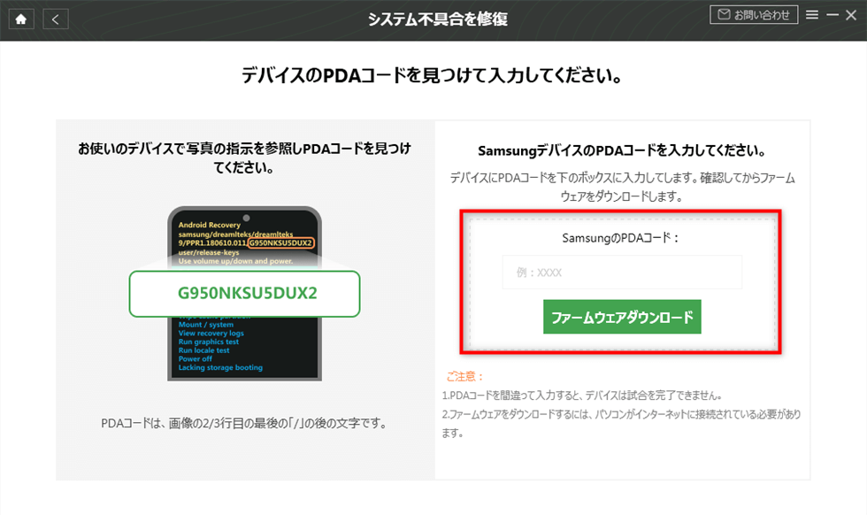 ステップ4:デバイスでPDAコードを探して入力し、その後「ファームウェアダウンロード」ボタンをクリックしてください。