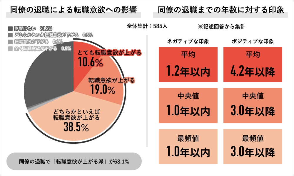 回答者全体の585人に同僚の退職による転職意欲への影響を聞くと、「転職意欲が上がる派」が68.1%と過半数を占め、「とても転職意欲が上がる」が10.6%、「転職意欲が上がる」が19.0%、「どちらかといえば転職意欲が上がる」が38.5%となりました。また、同僚の退職でネガティブな印象を持つ年数を聞くと、平均が1.2年以内、中央値が1.0年以内、最頻値が1.0年以内となりました。一方、同僚の退職でポジティブな印象を持つ年数を聞くと、平均が4.2年以降、中央値が3.0年以降、最頻値が3.0年以降となりました。