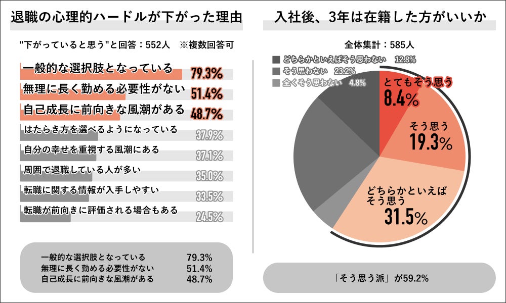 退職への心理的ハードルが下がっていると回答した552人にその理由を聞くと、「一般的な選択肢となっている」が79.3%で最多となり、次いで「無理に長く勤める必要性がない」が51.4%、「自己成長に前向きな風潮がある」が48.7%となりました。また、回答者全体の585人に、入社後3年は在籍した方がいいかを聞くと、「そう思う派」が59.2%と過半数を占め、「とてもそう思う」が8.4%、「そう思う」が19.3%、「どちらかといえばそう思う」が31.5%となりました。