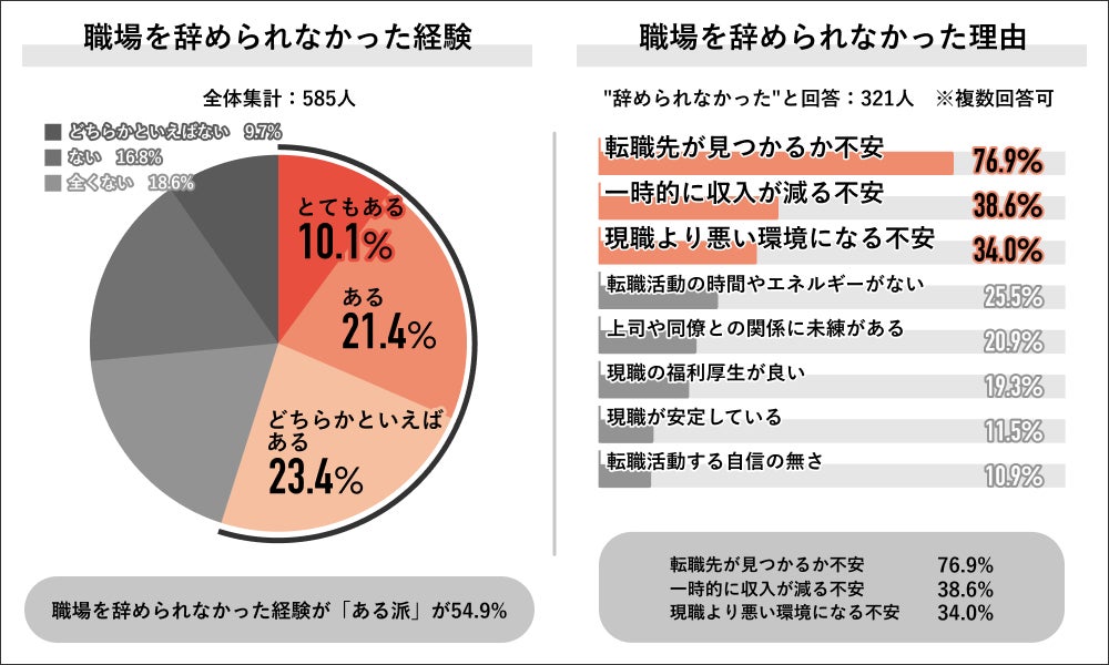回答者全体の585人に、職場を辞めようと思っても辞められなかった経験を聞くと、「ある派」が54.9%で過半数を占め、内訳は「とてもある」10.1%、「ある」21.4%、「どちらかといえばある」23.4%でした。辞められなかった経験ありと回答した321人にその理由を聞くと、「転職先が見つかるか不安」が76.9%で最多となり、次いで「一時的に収入が減る不安」が38.6%、「現職より悪い環境になる不安」が34.0%となりました。