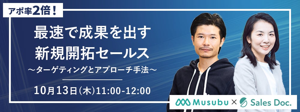 株式会社イノベーション(東証グロース 証券コード3970)のグループ会社である、株式会社Innovation & Co.(本社:東京都渋谷区、代表取締役社長:齊藤和馬、以下「Innovation & Co.」)は、法人営業の新規開拓を効率化するWebサービス「Musubu」を提供するBaseconnect株式会社(本社:京都府京都市、代表取締役:國重侑輝、以下「Baseconnect社」)と、「アポ率2倍!最速で成果を出す新規開拓セールス」をテーマとした共催セミナーを