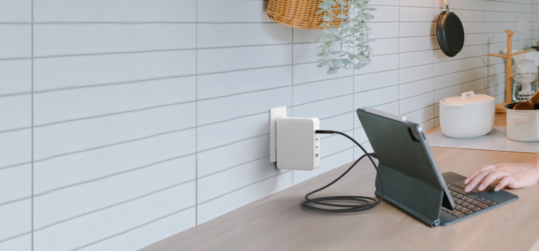 単ポート 140W 出力&PD3.1 対応で、4つのデバイスへ合計最大 142W での供給が可能で、交換式プラグ搭載した4ポートのUSB-C充電器です。