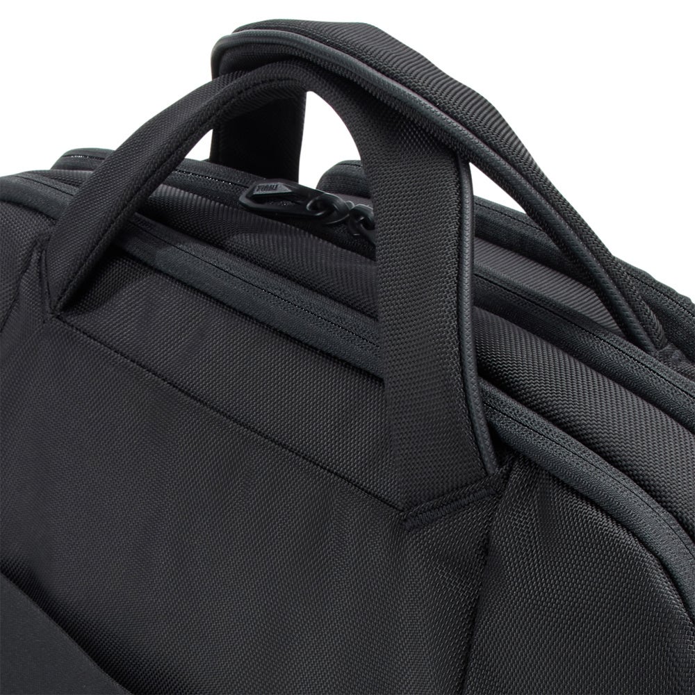 本体内外の多彩なポケットで仕事道具の整理収納性も抜群。メイン荷室はファイルディバイダーでA4ファイルや書類を分けて収納でき、⼤切な書類が汚れてしまう心配もありません。多数のポケットやメッシュポケットを備え、メモ帳やペンなど小物を仕分けて収納可能。頻繁に使⽤するスマートフォンやアイウェアはフロントの外部ポケットへ入れることでアクセス性が向上します。16インチMacBook®と12インチタブレットを安全に持ち運ぶ専⽤PCポケットも装備しています。トップハンドルと脱着式ショルダーストラップはパッド入りで重い荷物でも肩や手の負担を軽減。パススルーパネルでスーツケースに固定できるため、出張での使⽤にも最適です。