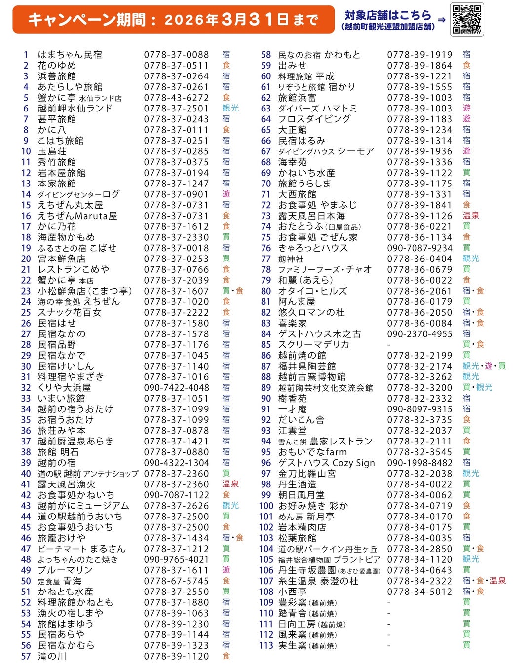 越前町観光連盟加盟の施設で 合計10,000円以上利用 ⇒ 3,000円キャッシュバック