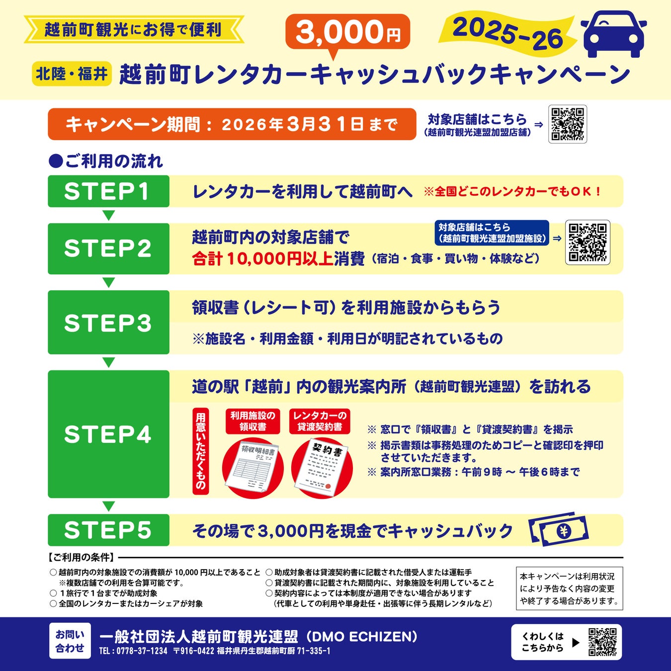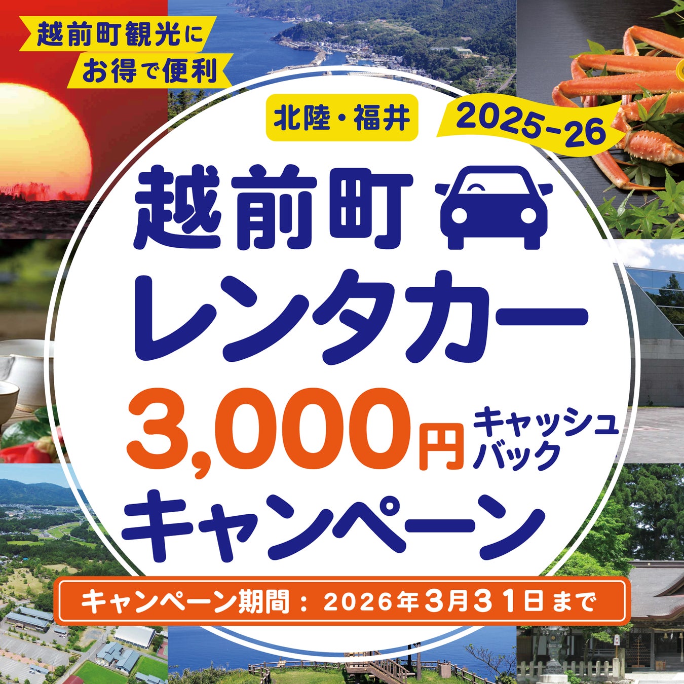 【福井県越前町】レンタカー3,000円キャッシュバックキャンペーンを2025年も実施します!