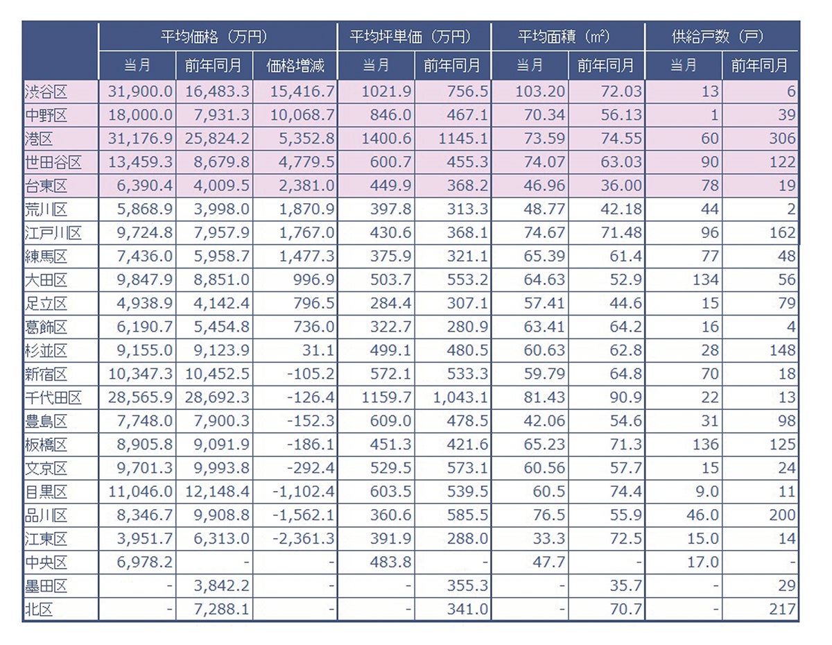 当社が調査した2024年3月の東京23区、行政区別分譲実績データ(速報値)です。