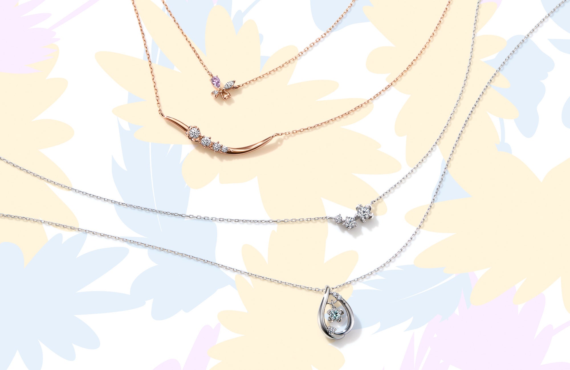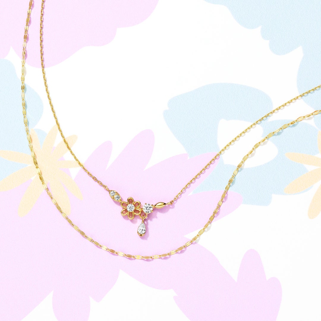 人気モチーフに”Flower cocktail”のエッセンスをプラスしたスプリング限定ジュエリー。抜け感のある軽やかな石座で花々を描いた二連ネックレスが、コーディネートを春爛漫に彩ります。