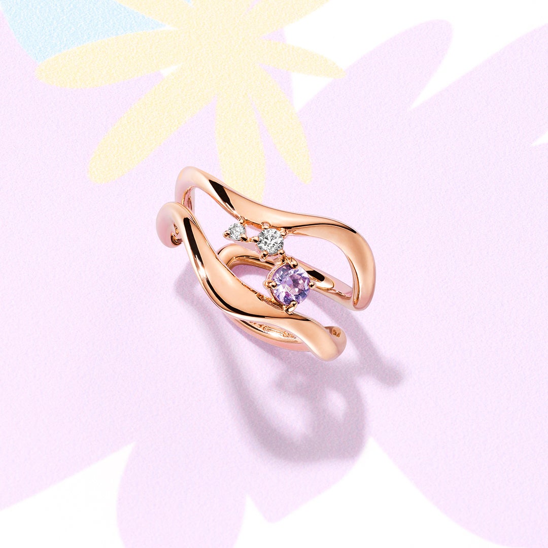 「門出」や「優しい思い出」という花言葉を持つスイートピー。甘い香りで春の訪れを感じさせる可愛らしい花を、ピンクアメシストのやわらかなカラーと地金のたおやかな曲線で表現しました。