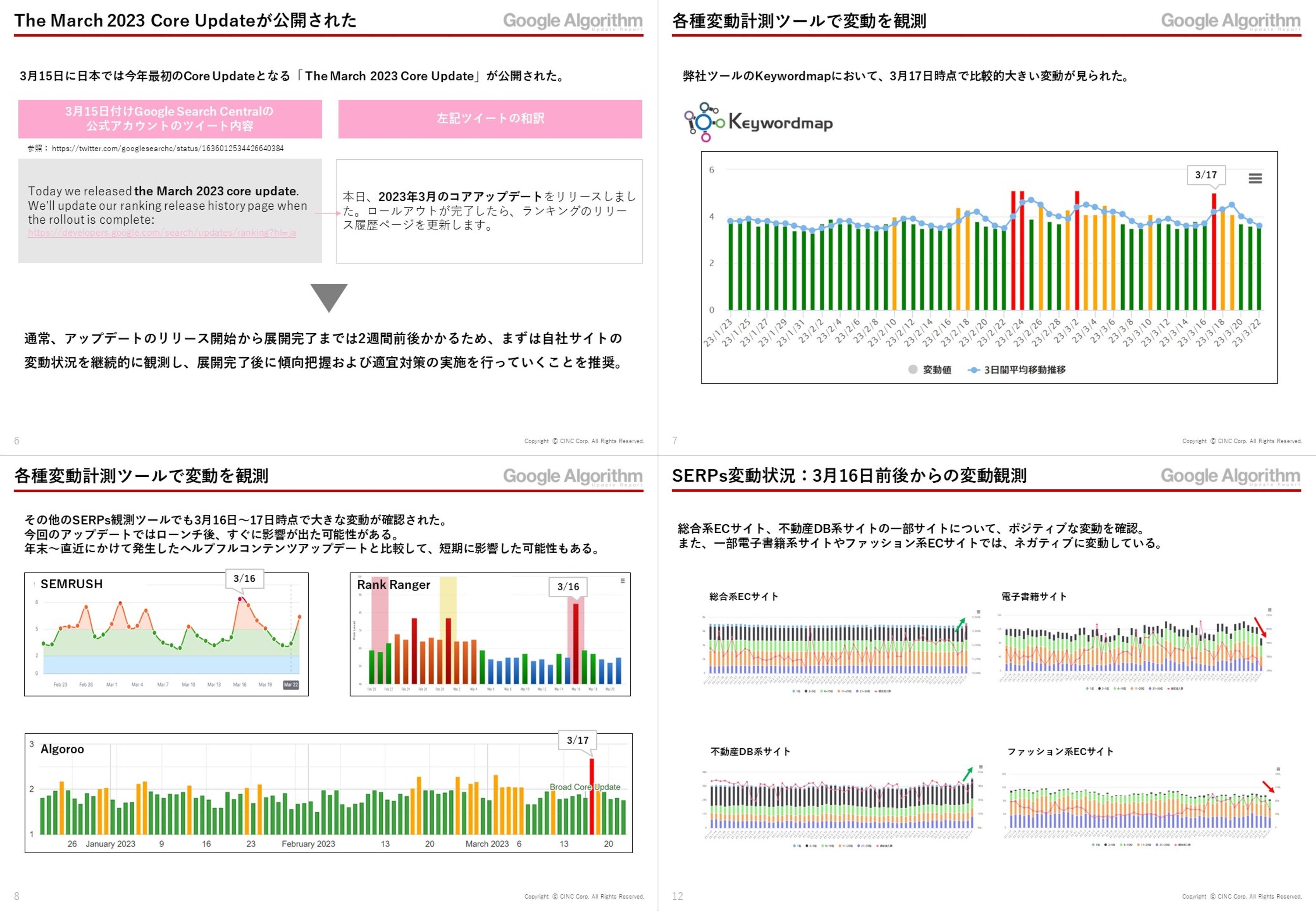 株式会社CINC(東京都港区 代表取締役社長 石松友典、以下 CINC)は、自社で開発・提供しているWebマーケティングの調査・分析ツール「Keywordmap(キーワードマップ)」を活用して、2023年3月15日にGoogeからリリースされた「The March 2023 Core Update」について調査した一次見解レポートを公開しました。