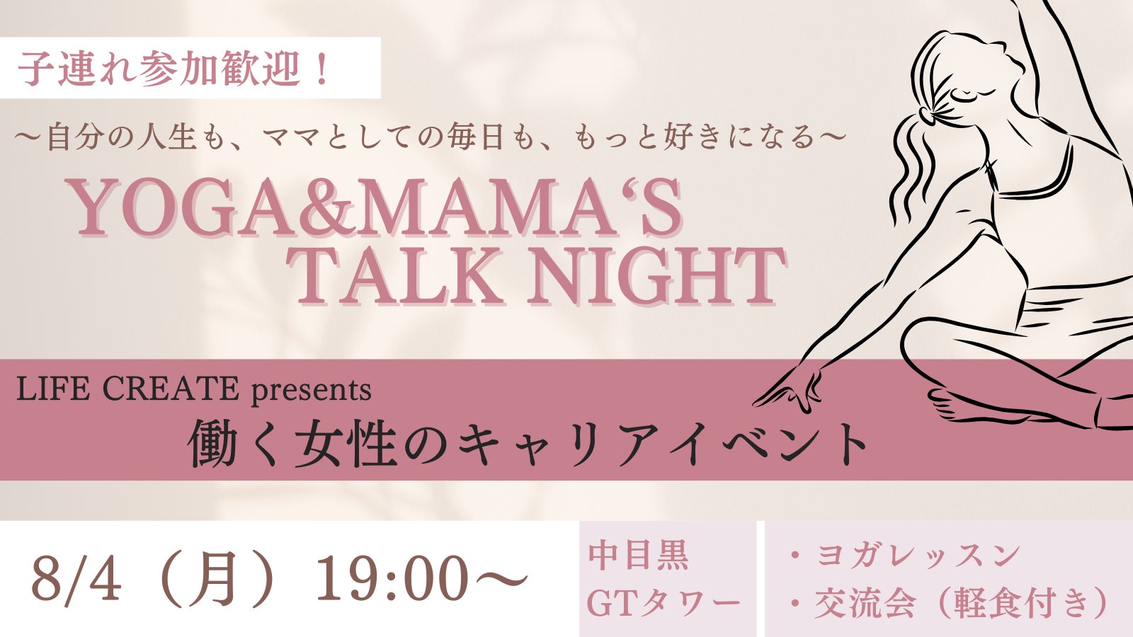 ~LIFE CREATE Presents 働く女性のキャリアイベント~子連れ参加歓迎!第2回は『YOGA&MAMA‘S TALK NIGHT」【日時:8/4(月)19時~於:中目黒GTタワー9階】