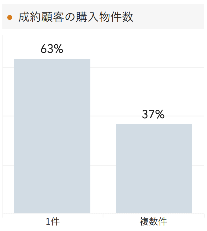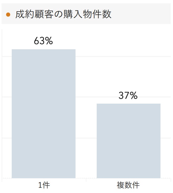 購入時の物件数が「1件」のみは63%(前月比4ptダウン)、複数物件は37%でした。複数物件を購入する方の割合は増加傾向で、マンスリーレポート開始以来最も高い割合と並びました。成約顧客のうち3人に1人が複数物件を購入しています。