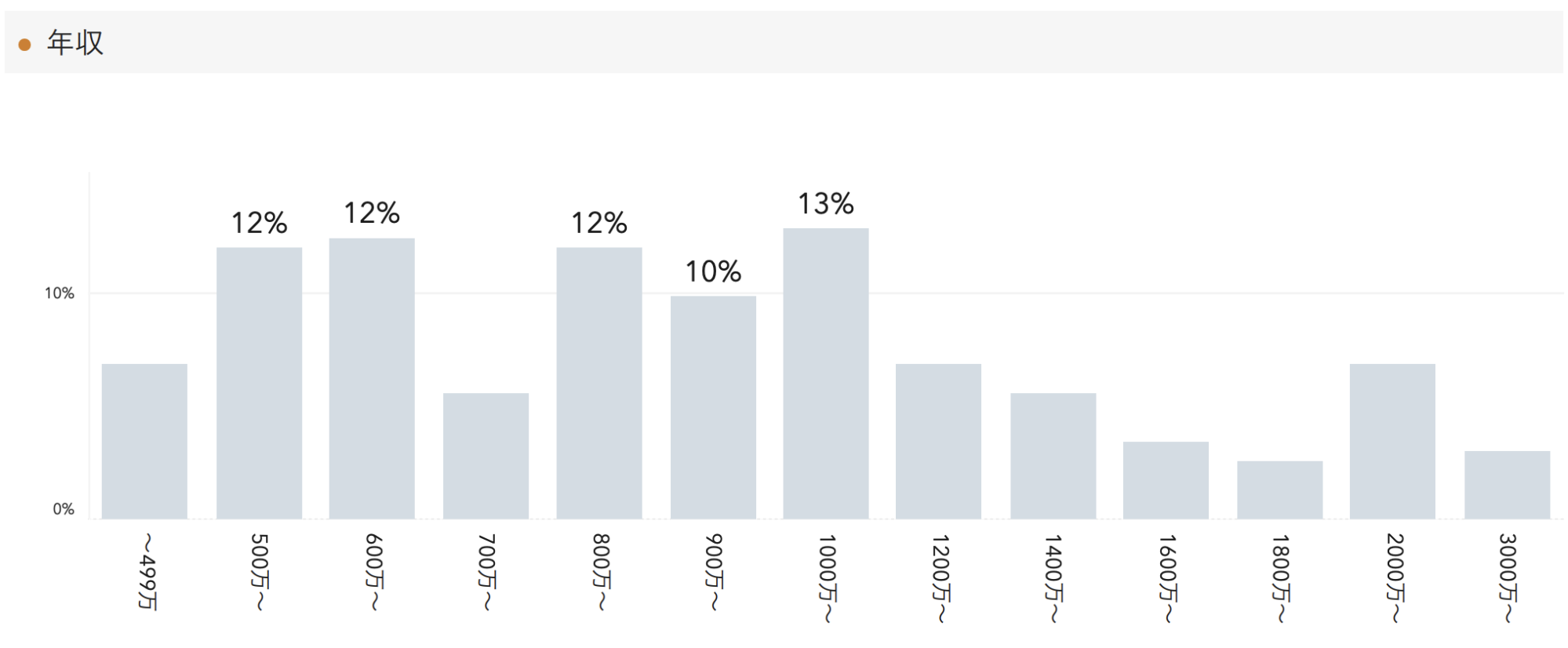 - 成約顧客の年収帯のボリュームゾーンは1,000万〜1,200万円未満で13%。次いで、 500万円台と600万円台と800万円台が同率で12%に