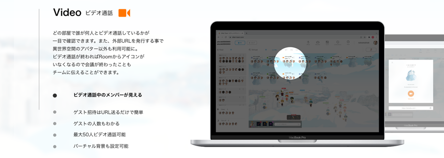 ビデオ通話が可能な部屋。 どの部屋で誰が何人とビデオ通話しているかが一目で確認できます。 また、外部URLを発行する事で異世界空間のアバター以外も利用可能に。 ビデオ通話が終わればRoomからアイコンがいなくなるので会議が終わったこともチームに伝えることができます。