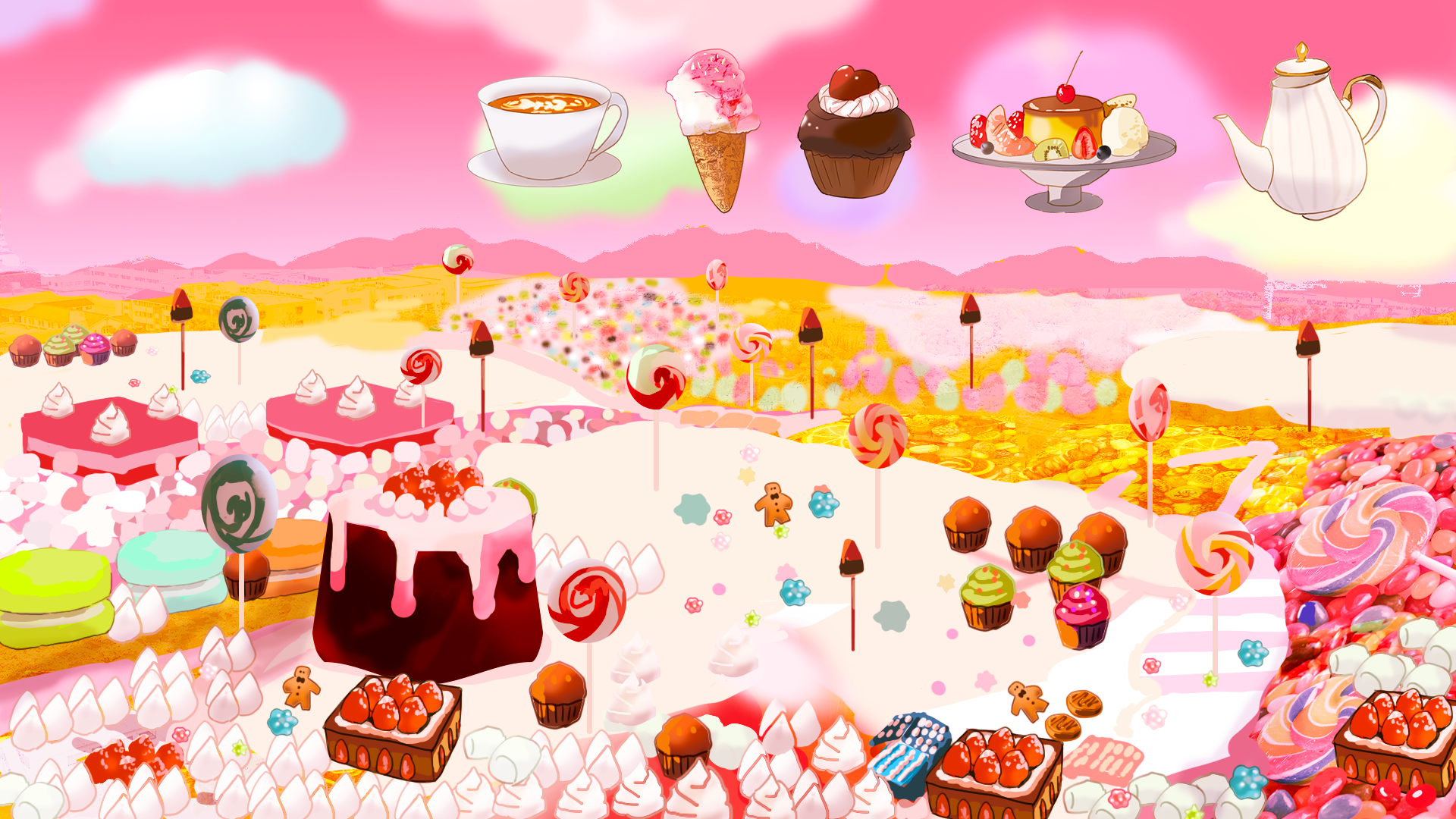 -見ているだけでワクワクしちゃうお菓子の世界をイメージした空間。プリンやカップケーキ、紅茶や綿菓子雲と一緒に。