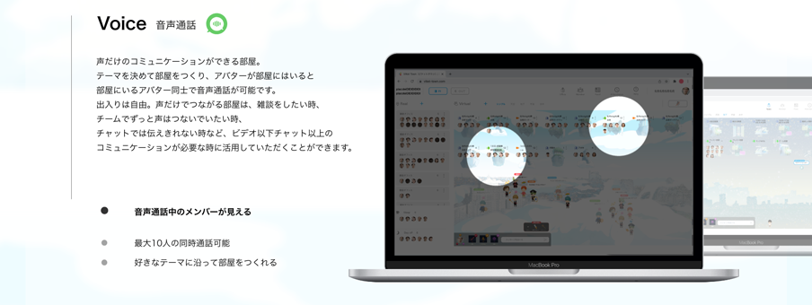 声だけのコミュニケーションができる部屋。 テーマを決めて部屋をつくり、アバターが部屋にはいると部屋にいるアバター同士で音声通話が可能です。 出入りは自由自在。声だけつながる部屋は、雑談をしたい時、 ビデオ会議をするほどでもない会議、チームでずっと声はつないでいたい時、チャットでは伝えきれない時など、ビデオ以下チャット以上のコミュニケーションが必要な時に活用していただくことができます。