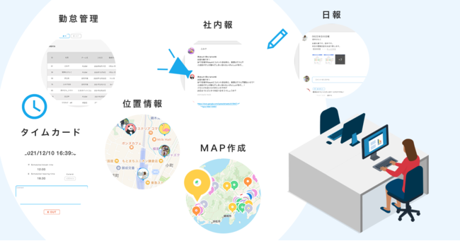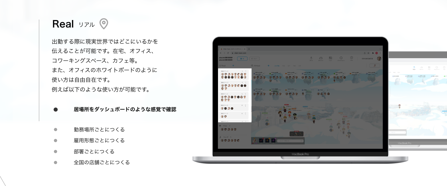 実は、ViKet town(ビケットタウン)の異世界空間では、リアルな世界では正確に取得できないすべての事柄を見える化することが可能です。 その為、勤怠管理、タイムカード、社内報、日報、位置情報、MAP作成機能、社員紹介等の既存機能に加えて、各組織やチームの状況に応じて、取得したい情報やアラートを設定でき、リアルなオフィス環境よりも、働く社員の健康管理が充実する機能も存在します。