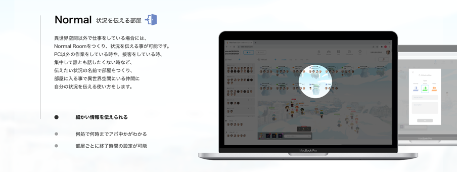 異世界空間以外で仕事をしている場合には、Normal Roomをつくり、状況を伝える事が可能です。 PC以外の作業をしている時や、接客をしている時、集中して誰とも話したくない時など、伝えたい状況の名前で部屋をつくり、部屋に入る事で異世界空間にいる仲間に自分の状況を伝える使い方をします。