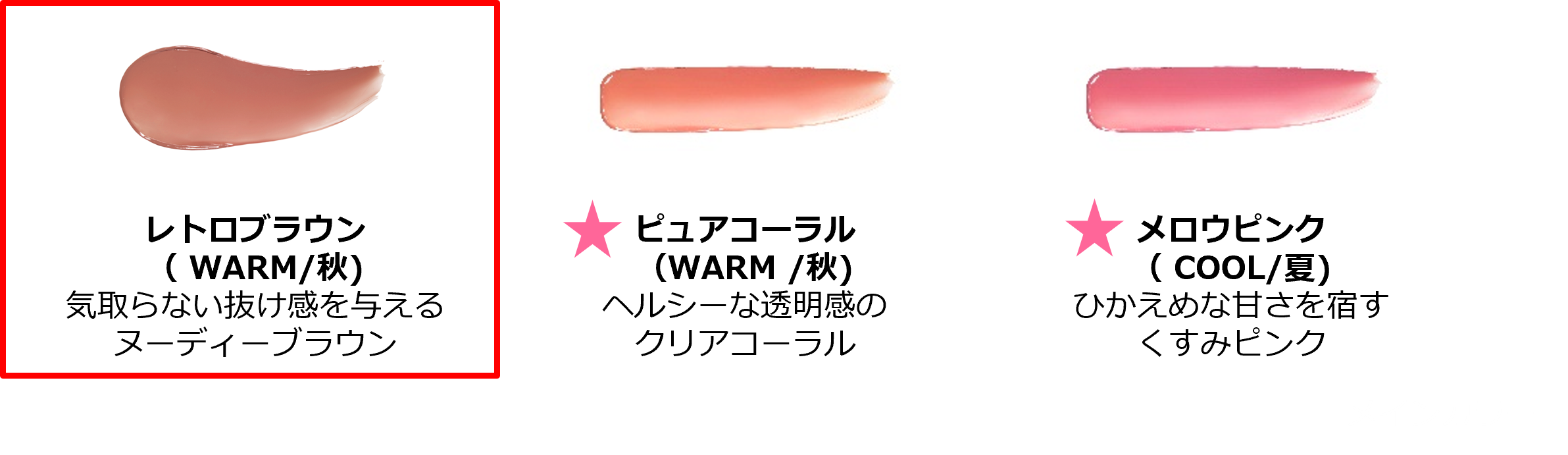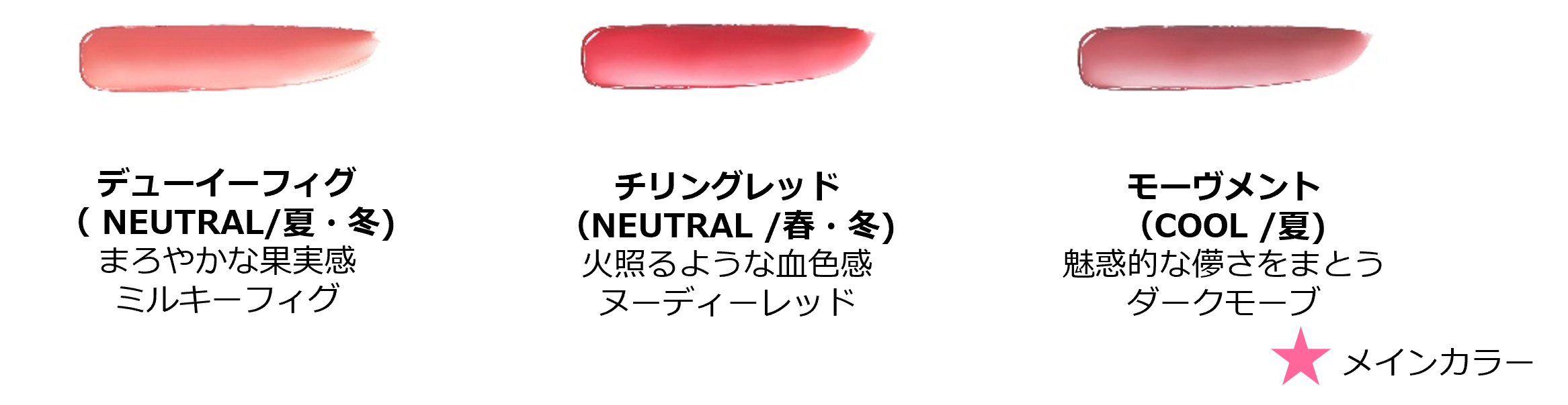 なめらかな使用感とべたつかない保湿感、ツヤ感、色持ちを実現。
