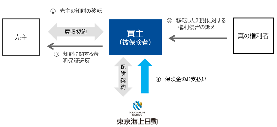 東京海上日動火災保険様が提供する本保険は、M&A取引に含まれる知財(主に特許権、実用新案権)の実施に関し、第三者から買主または買収対象会社に対して、知財侵害に起因する賠償または差止請求を提起される等の表明保証違反(※2)が発生した場合に買主に生じる賠償金や争訟費用などを補償します。