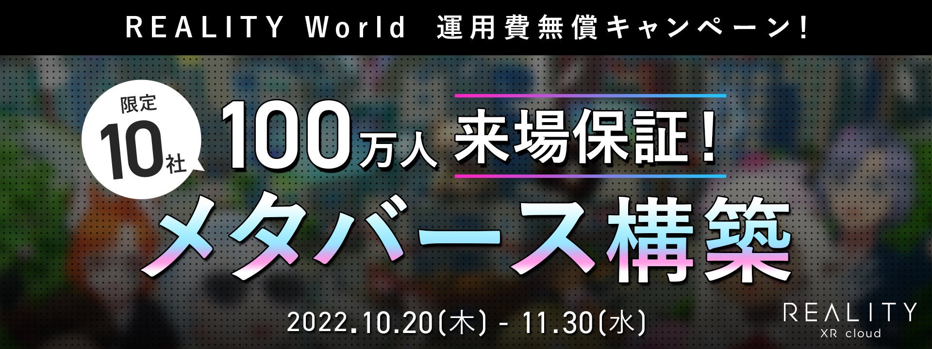 この度、アプリ「REALITY」の1,000万ダウンロードを記念して、法人向けメタバース「REALITY World」の運用費無償キャンペーン※を10月20日(木)から11月30日(水)まで開催します。