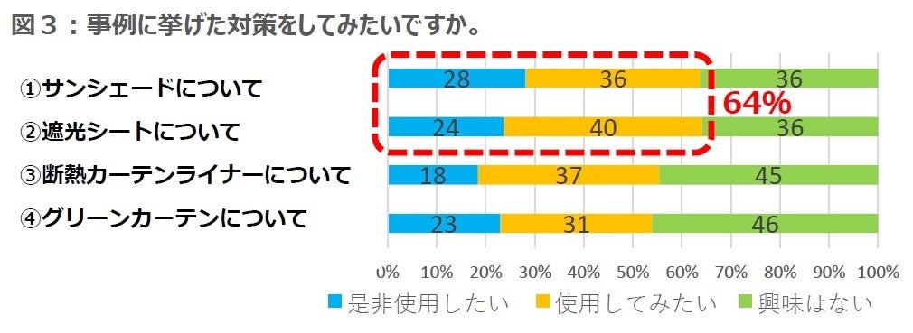 日中の直射日光を遮り、室温上昇を抑える対策について、 具体的な事例を4点挙げて聞いたところ、すべ