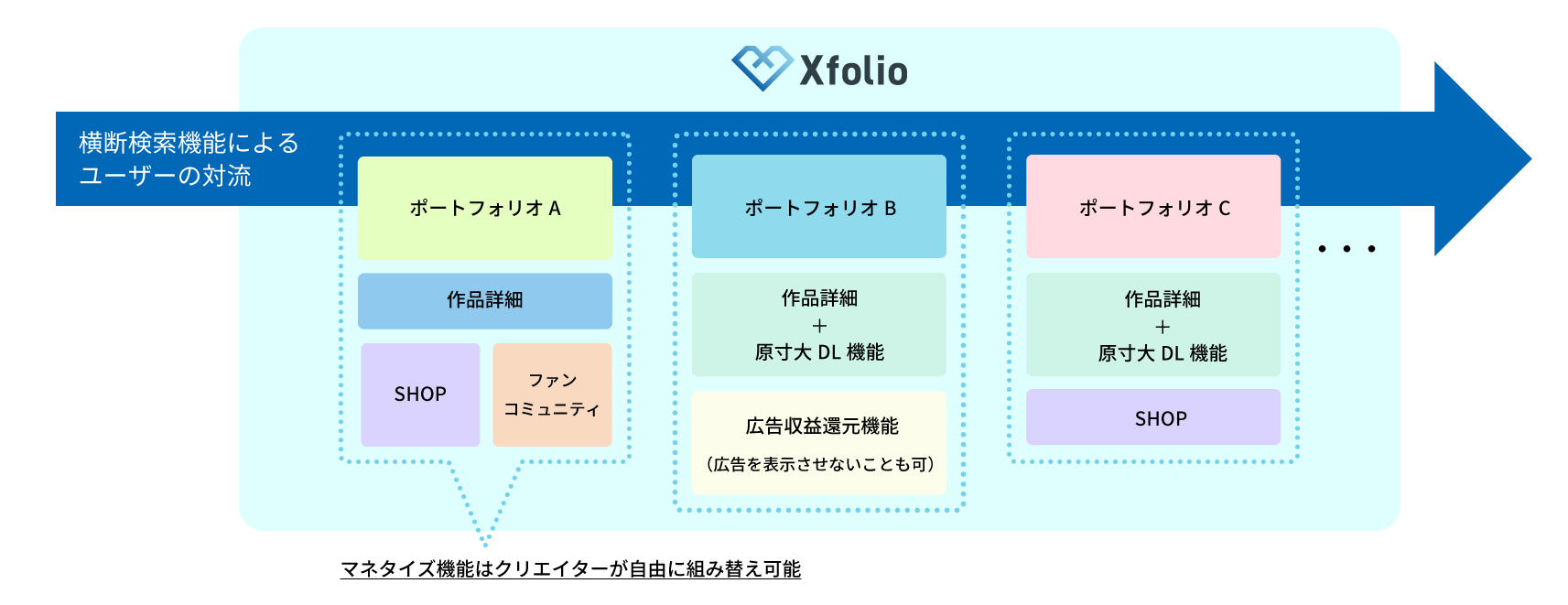 SHOPやファンコミュニティ、原寸大ダウンロードなどの各種マネタイズ機能をクリエイターが自由に選択し、ポートフォリオに盛り込むことが可能。また、広告収益を還元する機能も備えています。