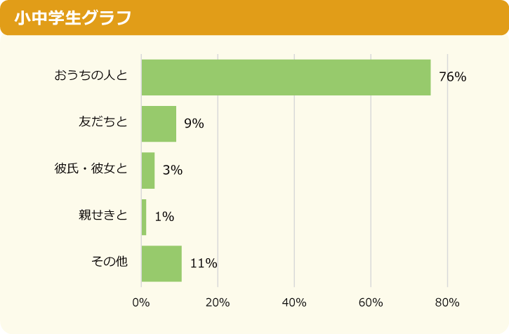 今年のクリスマスの日の予定を聞いたところ、半数以上の人が通常の日とは違った過ごし方をするようで「いつもより豪華なごはんやケーキを食べて過ごす」との回答は43%、「クリスマスパーティーをする」との回答は27%でした。一緒に過ごす相手を聞いた質問では76%が「おうちの人」と回答しました。