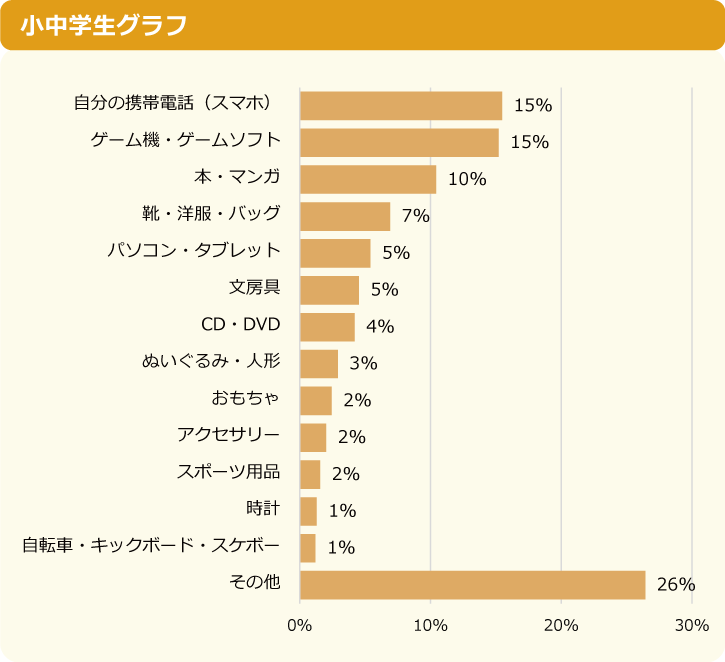 小中学生の今年一番欲しいクリスマスプレゼントは、「自分のスマホ」「ゲーム機・ゲームソフト」がともに15%で同率の1位でした。