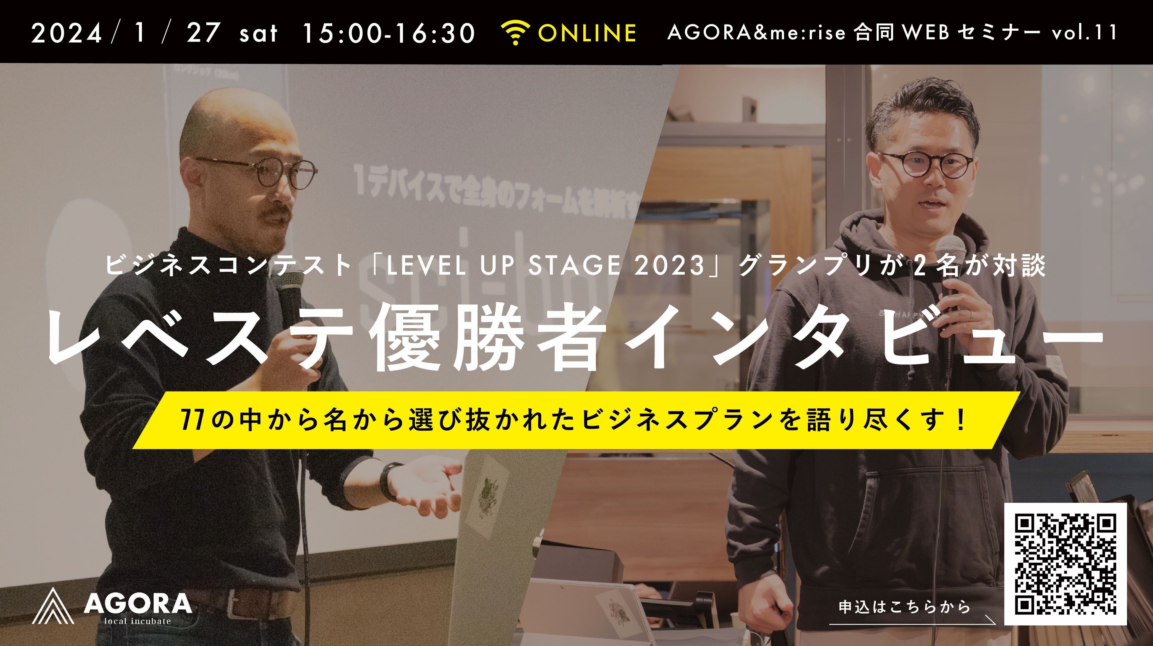 夢が加速する!ビジネスコンテスト「LEVEL UP STAGE 2023」グランプリ2名の対談が実現!1月27日(土)WEBセミナーにて「レベステ優勝者インタビュー」を開催@コワーキングオフィスアゴラ