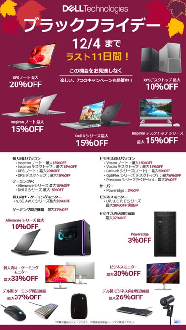 デル・テクノロジーズ株式会社(本社:東京都千代田区、代表取締役社長:大塚 俊彦、以下、デル・テクノロジーズ URL:https://www.dell.com/ja-jp)は、2023年12月4日(月)(ラスト11日間)まで実施している「ブラックフライデー」のお得な情報を公開しました。最新のノートパソコン、デスクトップ、ゲーミングPC、モニター、サーバー、ワークステーション、周辺機器など、欲しかったあの製品をお得に入手するチャンスです。是非、お見逃しなく。