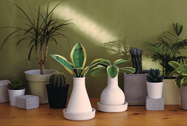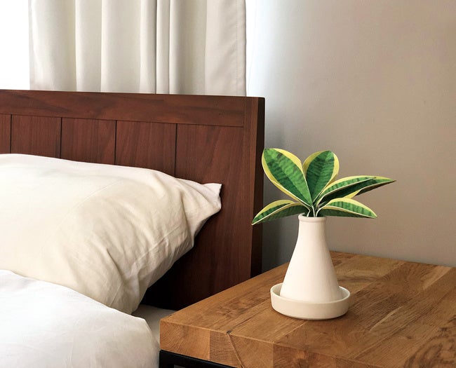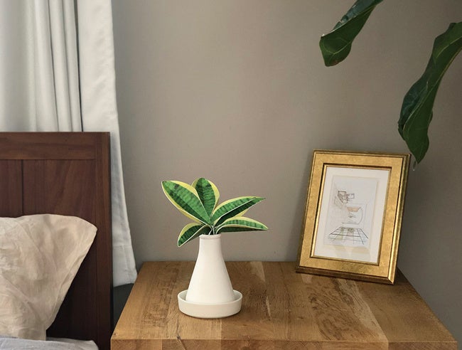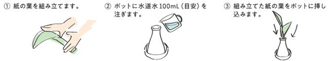 素焼きの陶器ポットに100mLの水を注ぎ植物を模したペーパーリーフを挿しておくだけで電気は不要。
