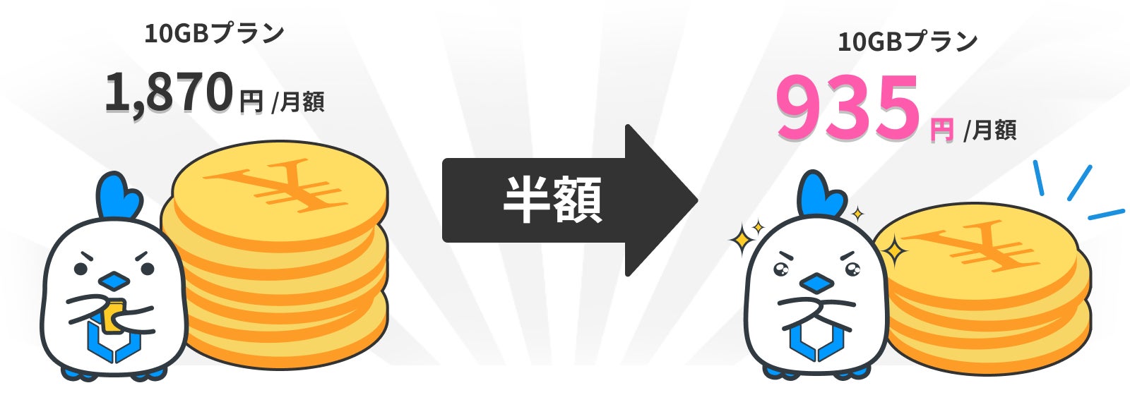 ※割引額は、「プラン・料金」ページに記載のプラン表内「料金(月額)」の金額の半額分となります。(割引額が小数点となった場合、繰上げとなります。)