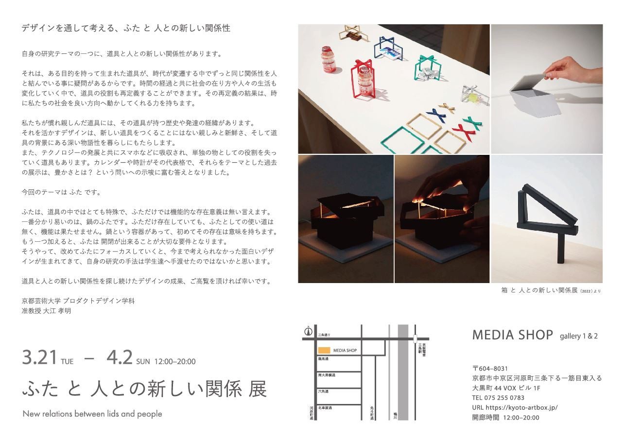 学校法人瓜生山学園 京都芸術大学(京都市左京区/学長 吉川左紀子)プロダクトデザイン学科は、2023年3月21日(火)より、道具と人との新しい関係性を探ることを試みる「ふた と 人との新しい関係展」展を京都市河原町三条の「MEDIA SHOP gallery1, gallery2」にて開催します。
