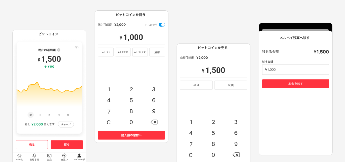メルコインは、これまでビットコイン取引を行ったことがない方でも、かんたん・安心にご利用でき、ビットコインを身近に感じていただくことを目指して、ビットコイン取引サービスを開始しました。「メルカリ」のビットコイン取引サービスは、いつもご利用いただいているメルカリアプリで完結(最短30秒で申し込みが完了)し、すぐにビットコインの売買を始めることができます。また、「メルカリ」で使わなくなったモノを売って得た売上金・ポイント(※4)を活用して1円から購入できる、初めての方でも安心して始めることができるサービスです。