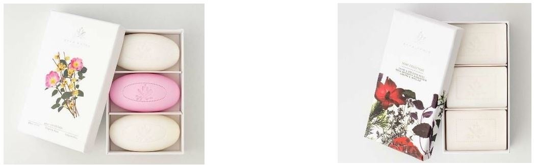 (右)柔らかくクリーミーな泡立ちで、肌に弾力を与えるローザモスクエータ&ゼラニウム ソープ、タイム&レッド ルビンバジル ソープ、ジュニパー&ホワイトファー ソープ(各150g)のセット。