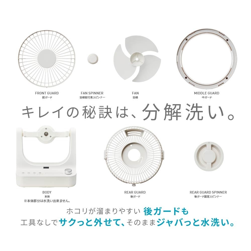 「ファン部の6つのパーツを工具なしで分解できる」という新しい構造により、いままでになく簡単にお手入れすることができます。空気の吸いこみ口であり、最も埃がたまりやすいのに取り外せず掃除がしづらかった後ガード部分を簡単にお手入れできるため、常にきれいな空気を循環させることができます。
