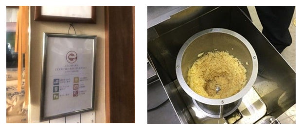 丸亀製麺では、省エネ設備と環境施策の両面で先進的な店舗をピックアップし、特に環境に配慮した店舗(エコKAN店舗)としてモデルケース化・認定制度を設けています。「エコKAN店舗」はエコロジーとエコノミーの両立でKANDOを生み出す店舗として、認定条件の一つとして「エコマーク」の取得を義務付けており、店舗には専用のPOPとともにエコマーク認定証を掲示しています。