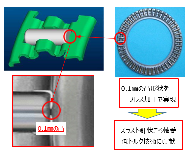 精密プレス加工で0.1mmの凸形状の加工が可能となり、スラスト針状ころ軸受で最大50%の低トルク化を実現しました。