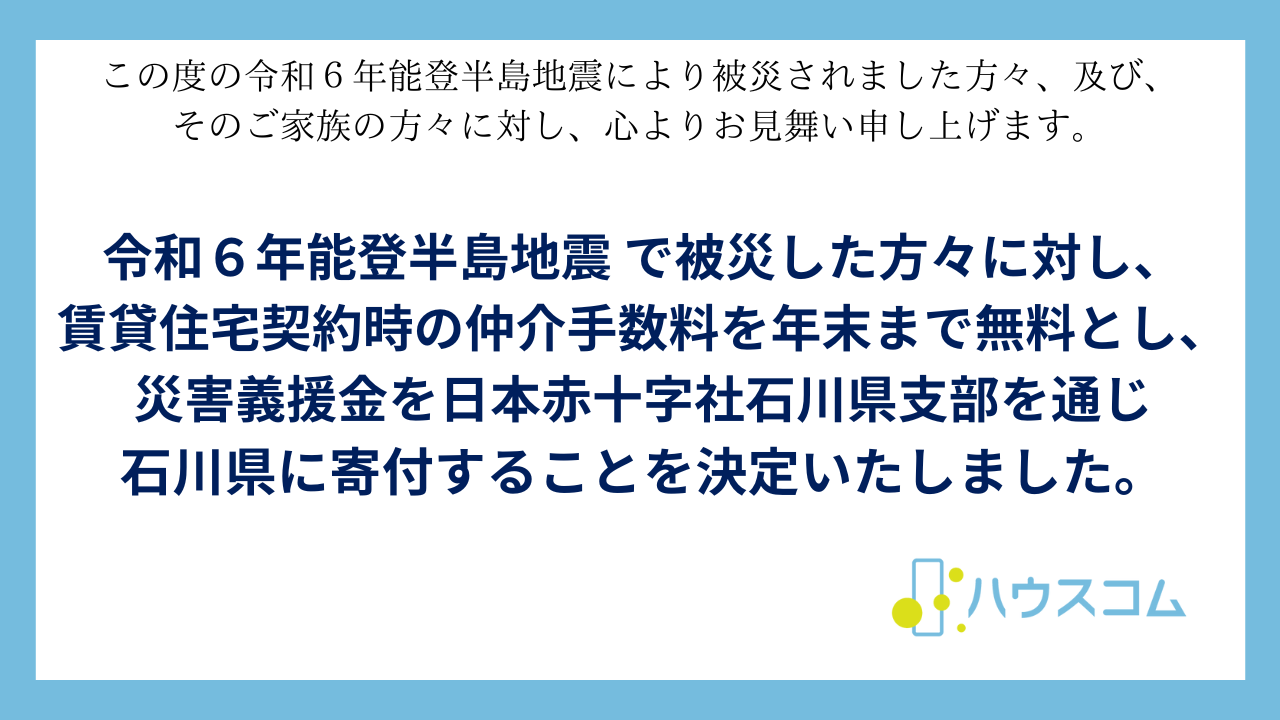 リアル拠点と不動産DXのシナジーでライフスタイルデザインを追求するハウスコム株式会社〔所在地:東京都港区 代表取締役社長執行役員:田村 穂 スタンダード市場 コード番号:3275、以下ハウスコム〕は、この度、被災された方々の部屋探しの際に、ハウスコムグループが運営する店舗において、2024年の約1年間、賃貸住宅契約時の仲介手数料を無料とすることを決定いたしました。当社グループは北陸地方(新潟、富山、石川、福井の4県域)に店舗を構えておりませんが、被災者の方々が今後、日本各地で部屋探しを必要とされる際に、各々のお気持ちに寄り添い、きめ細やかなサポートに誠心誠意努めてまいります。また、被災者の方々の支援にお役立ていただくため、義援金100万円を日本赤十字社石川県支部と連携する石川県に寄付することも決定いたしました。