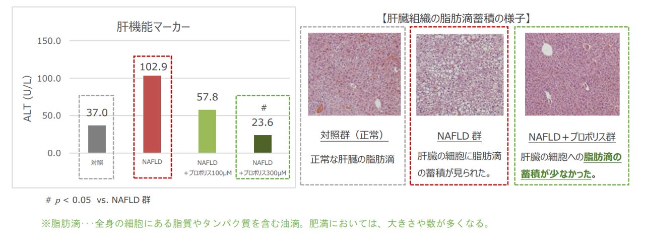 プロポリスの投与により、血中の肝機能マーカーの数値がNAFLD群の1/4に抑制され(肝機能が改善)、肝臓組織ではNAFLD群より脂肪滴が少ないことが確認された(脂肪蓄積を抑制)。
