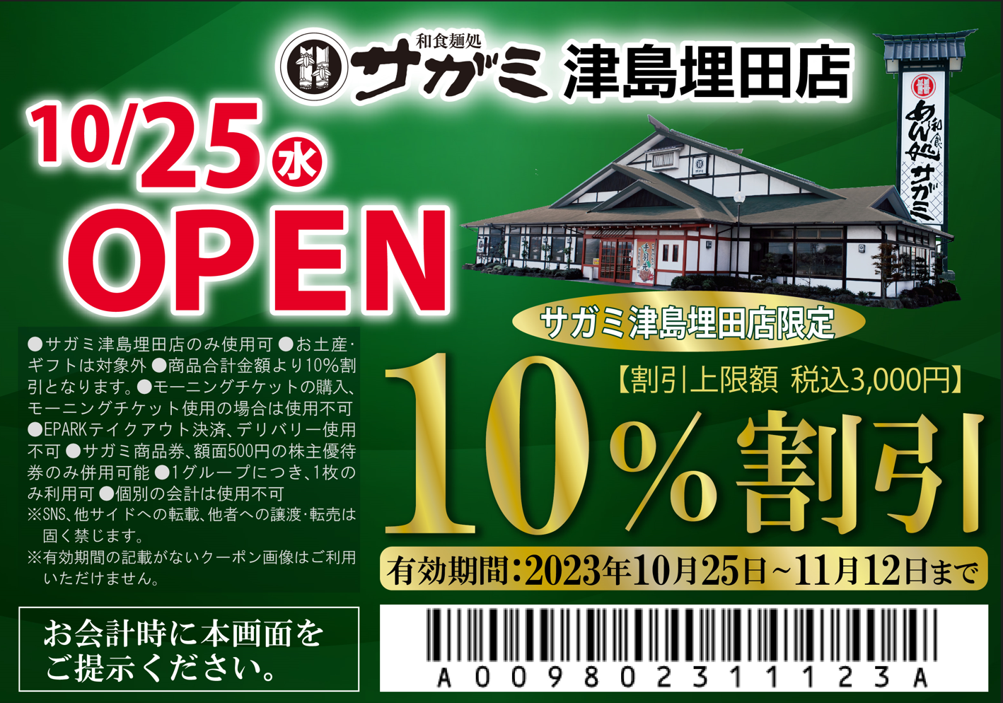 また、サガミ常滑店限定でご利用いただける割引券を記載いたしました。