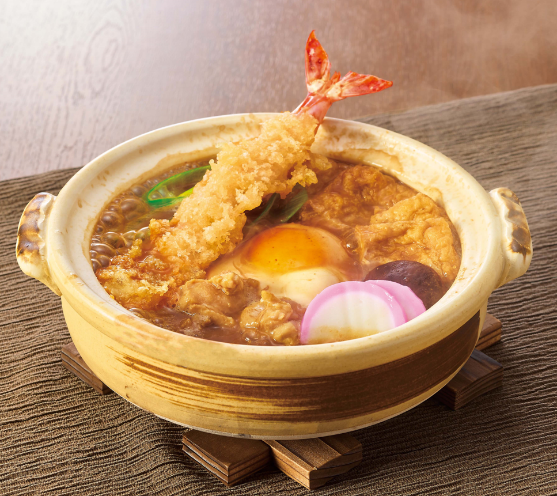 土鍋にぐつぐつと煮立っているみそ煮込に大きな 海老天ぷらをトッピングした、サガミ自慢の逸品です。