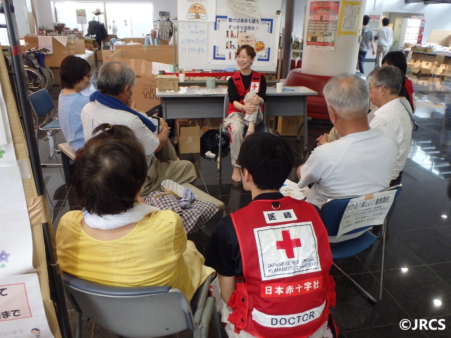 また、車中泊や慣れない避難所生活における「エコノミークラス症候群」の対策のため、日赤熊本健康管理センターを中心としたエコー技師が24時間体制でDVT(深部静脈血栓症)のスクリーニングを行い、診断結果に応じて弾性ストッキングの配布や投薬治療を実施。予防活動として、健康体操教室を開催するなど、被災者に寄り添った様々な活動を展開しました。