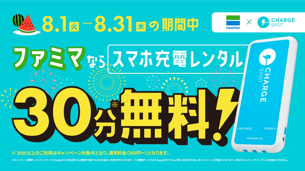 「ファミマならChargeSPOTが30分無料キャンペーン」を8月1日(火)から実施