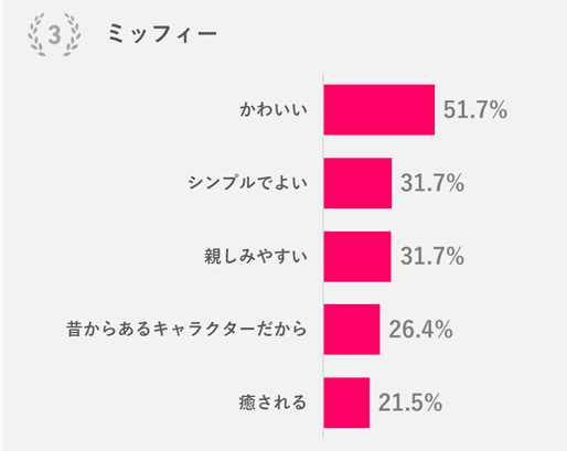 3位は「ミッフィー」。50代で2位、60代で4位、70代以上で7位だった。好きな理由の1位は「かわいい」、2位は「シンプルでよい」、3位は「親しみやすい」。