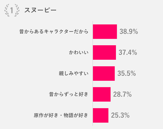 「好きなキャラクター」の1位は「スヌーピー」。すべての年代で1位だった。好きな理由の1位は「昔からあるキャラクターだから」、2位は「かわいい」、3位は「親しみやすい」。
