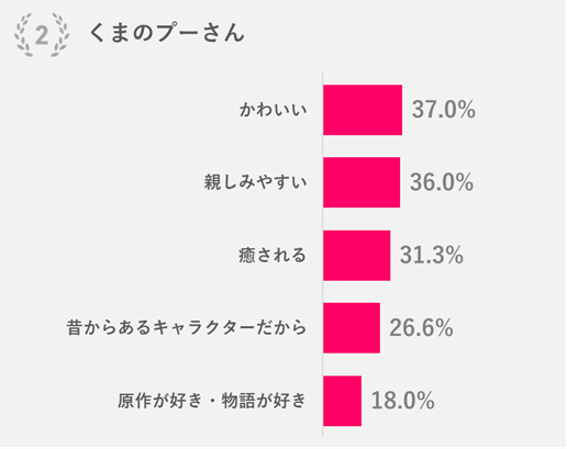 2位は「くまのプーさん」。50代・60代では5位、70代では4位と年代別では上位ではないものの、他のキャラクターの順位にばらつきがあったため、総合的に2位となった。好きな理由の1位は「かわいい」、2位は「親しみやすい」、3位は「癒される」。