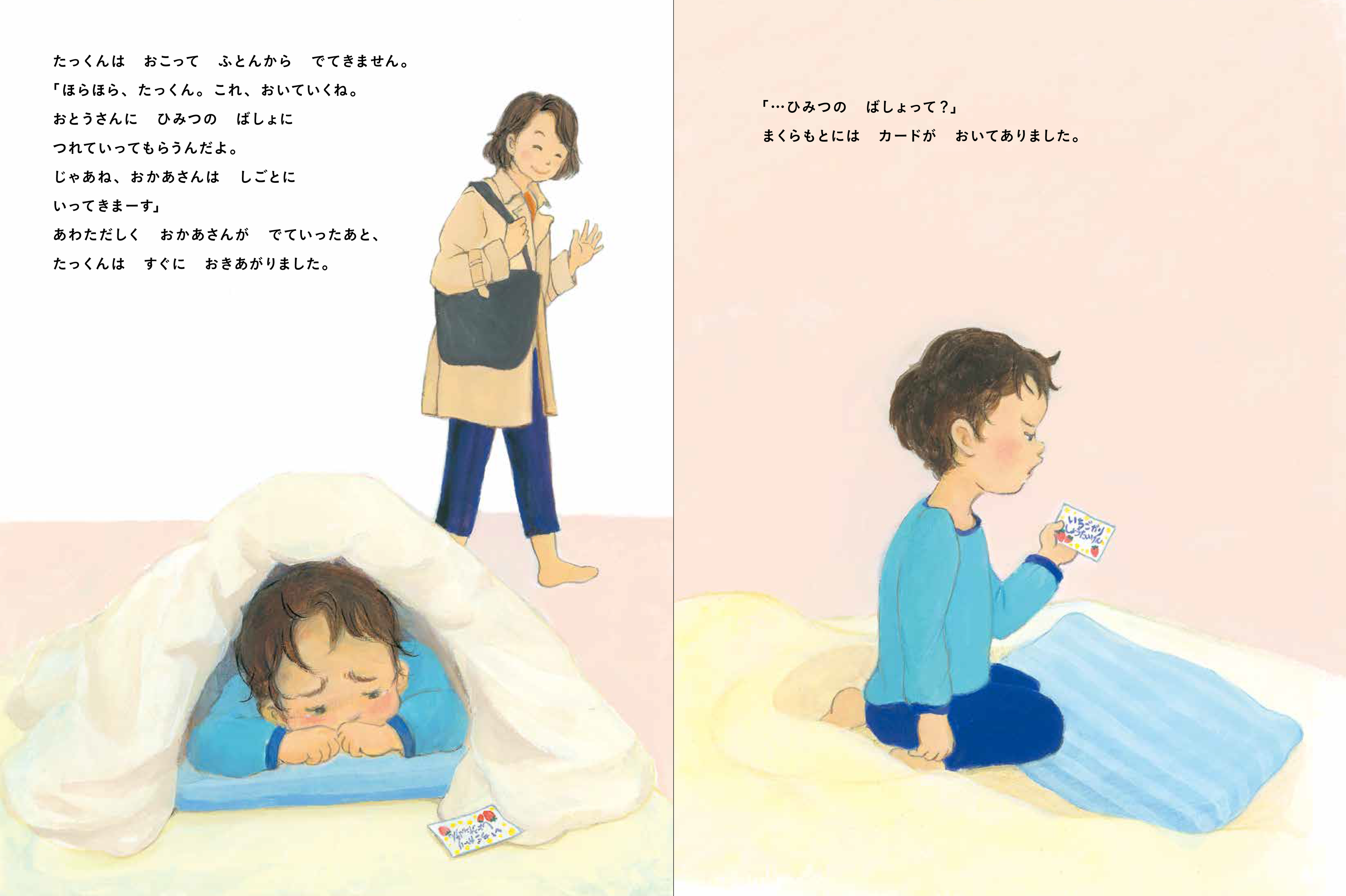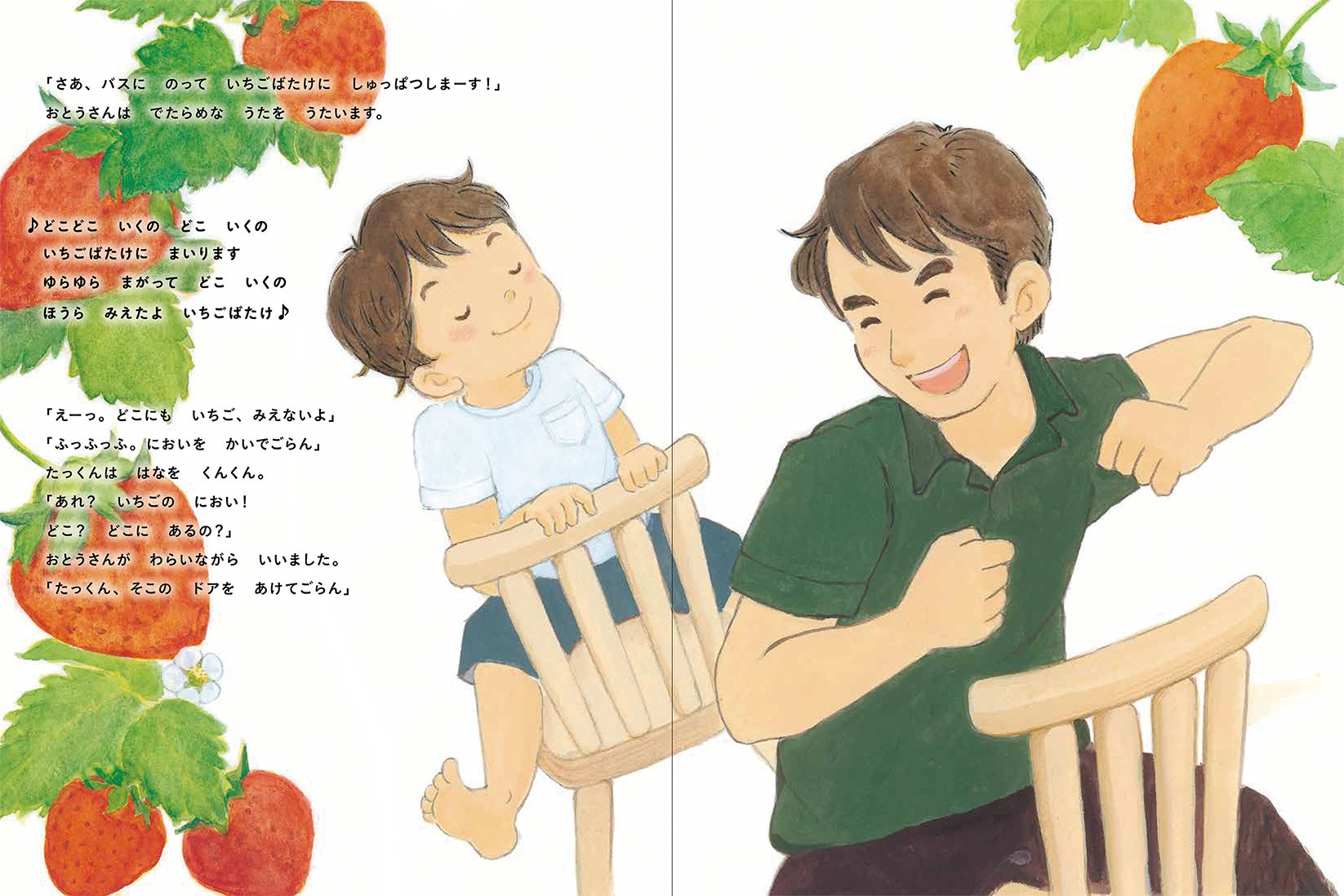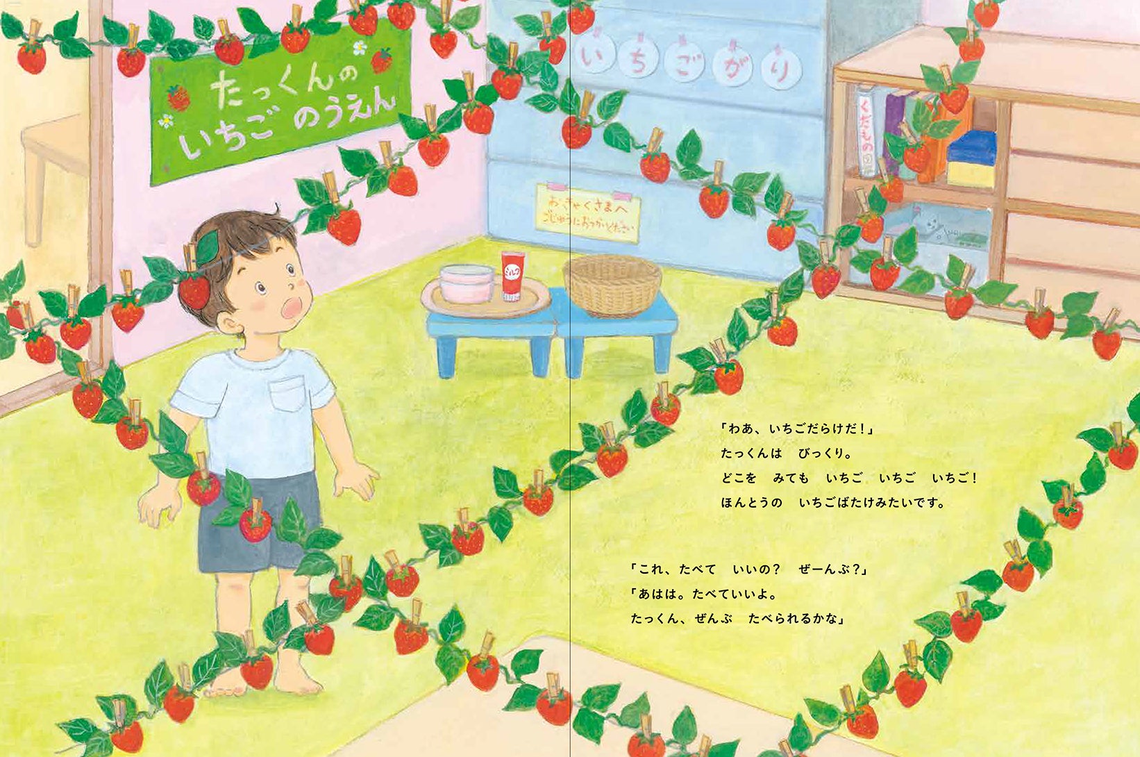 今日は保育園で「いちごがり」がある日。だけど、たっくんは保育園をお休みです。しかし、起きるとまくらもとに、いちごがりしょうたいけんのカードが。